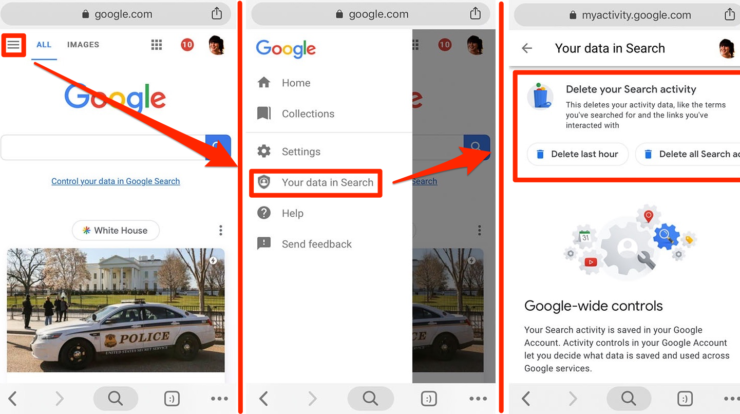 Any Google search will have three lines on its left side. Tap them, and you will open up a ‘your data in search’ option. Then, Google will show you what you searched for, and it will also provide you with the possibility of getting rid of everything.