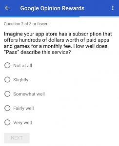 XDA and Kieron Quinn found code references and a survey created by Google Opinion Rewards asking about subscription services on Android. The survey says that the pass might offer apps and games that are “hundreds of dollars” worth for a monthly rate yet not specified. Here’s a look at the survey: