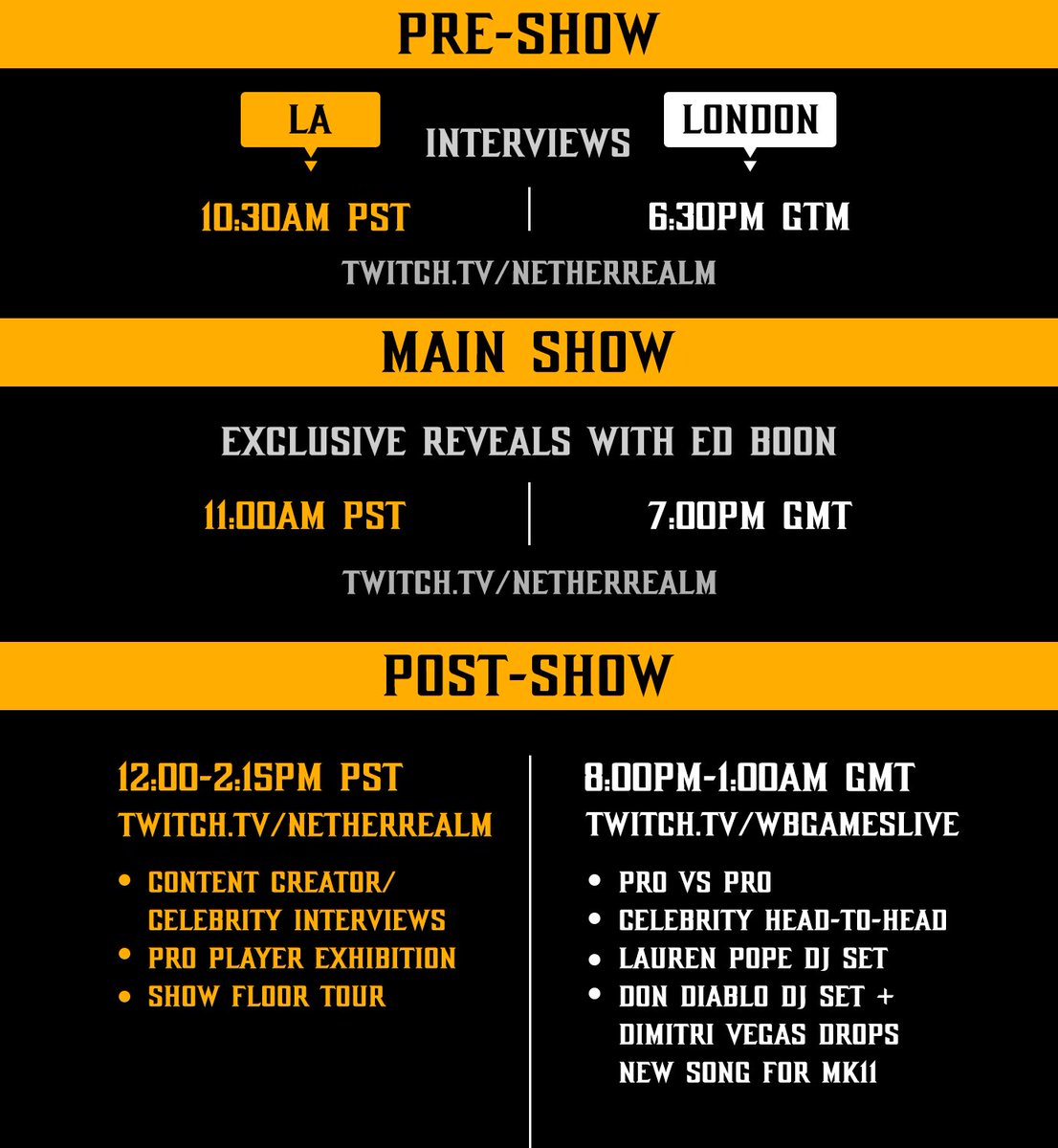 Here is the schedule of the event, posted on the official Mortal Kombat 11 Twitter account: